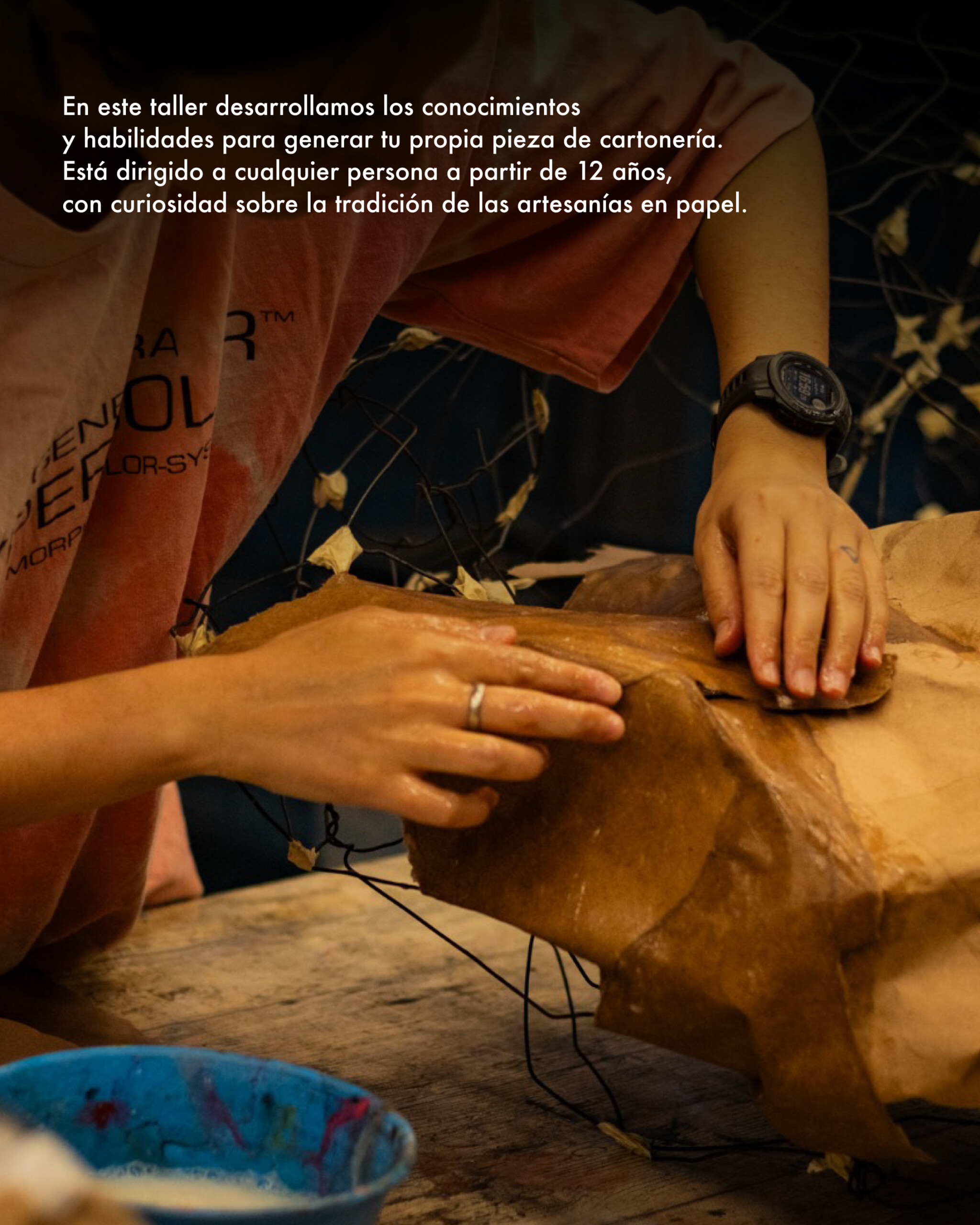 En este taller desarrollamos los conocimientos y habilidades para generar tu propia pieza de cartonería. Está dirigido a cualquier persona a partir de 12 años, con curiosidad sobre la tradición de las artesanías en papel.